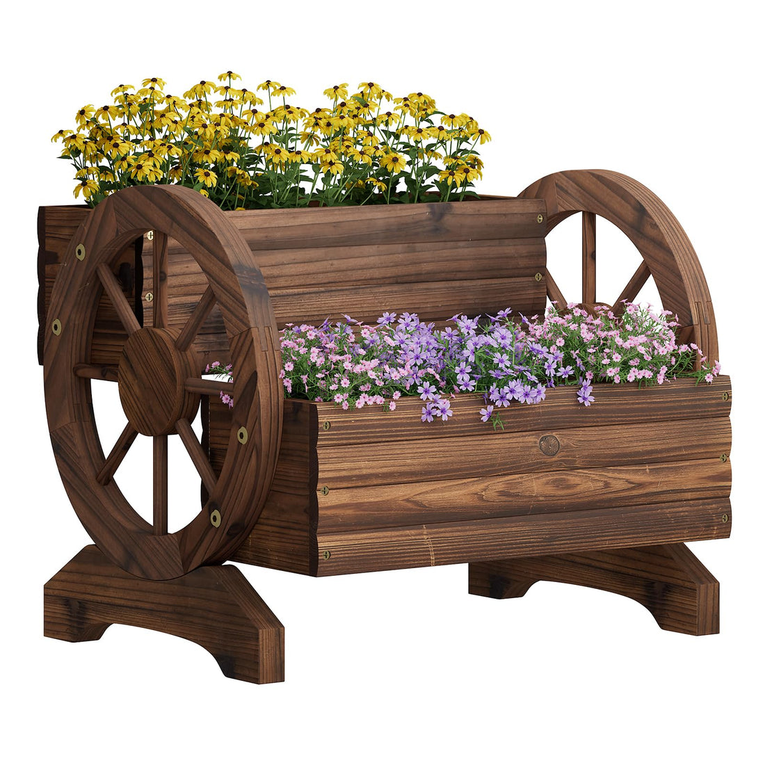 Wooden Wagon Planter with Wheels - Mobile Garden Cart for Patio & Balcony