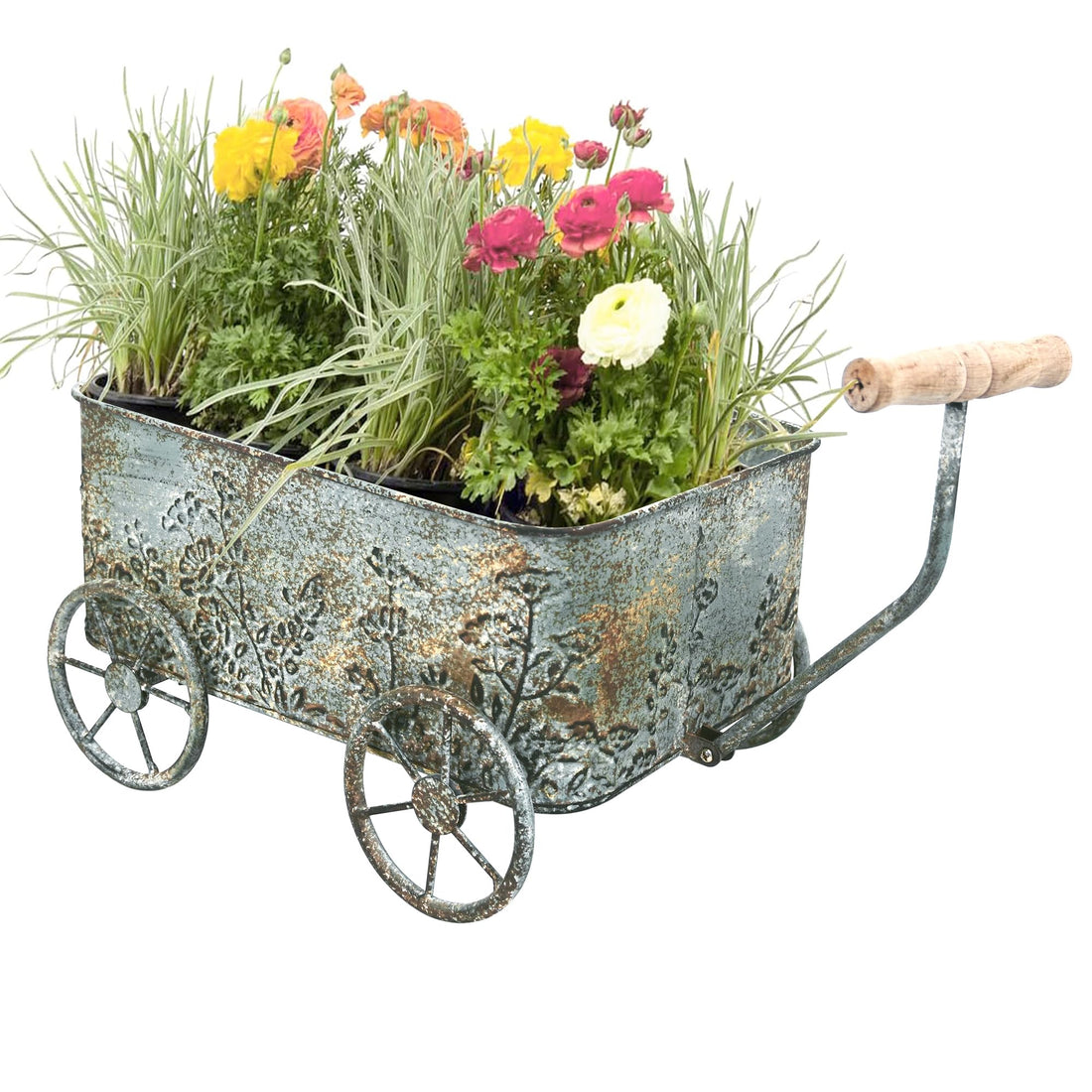 Vintage Metal Wagon Planter - Decorative Garden Cart with Wooden Handles