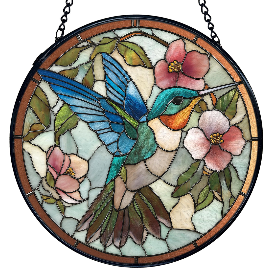 Hummingbird Stained Glass Sun Catcher – Cottagecore Blue Floral Window Hanging Decor