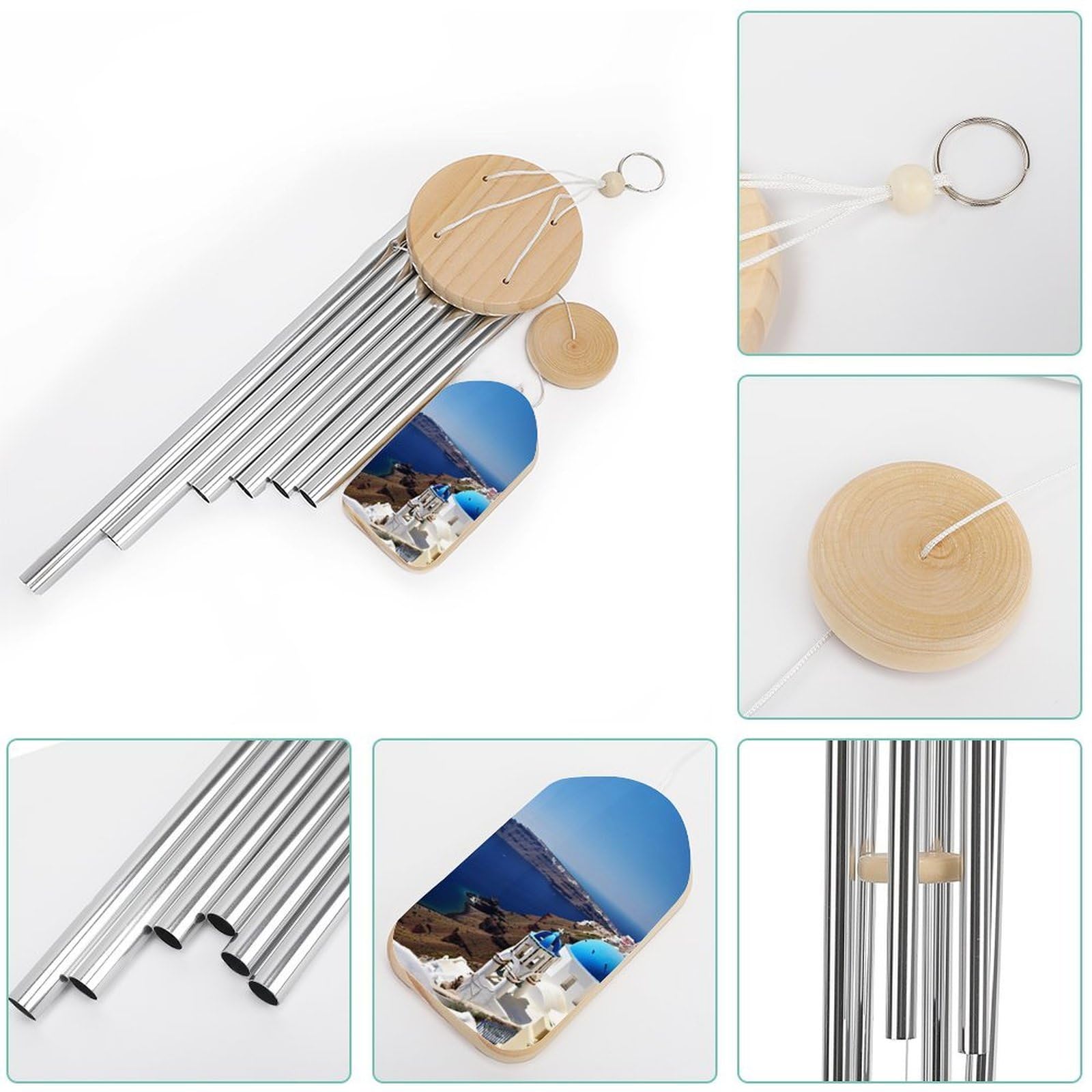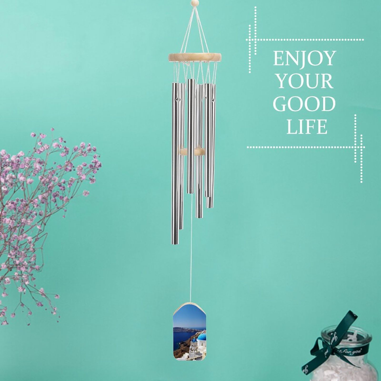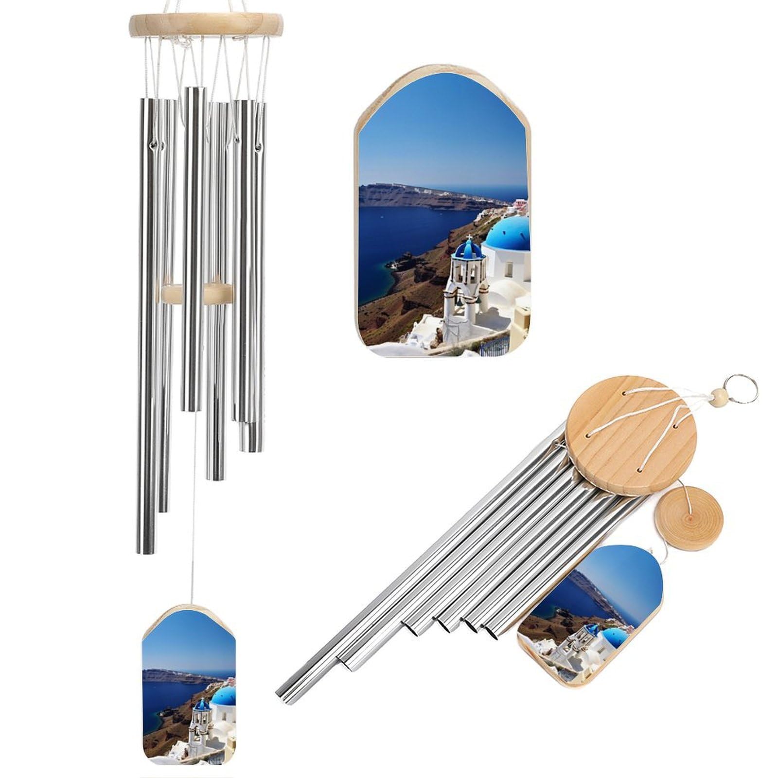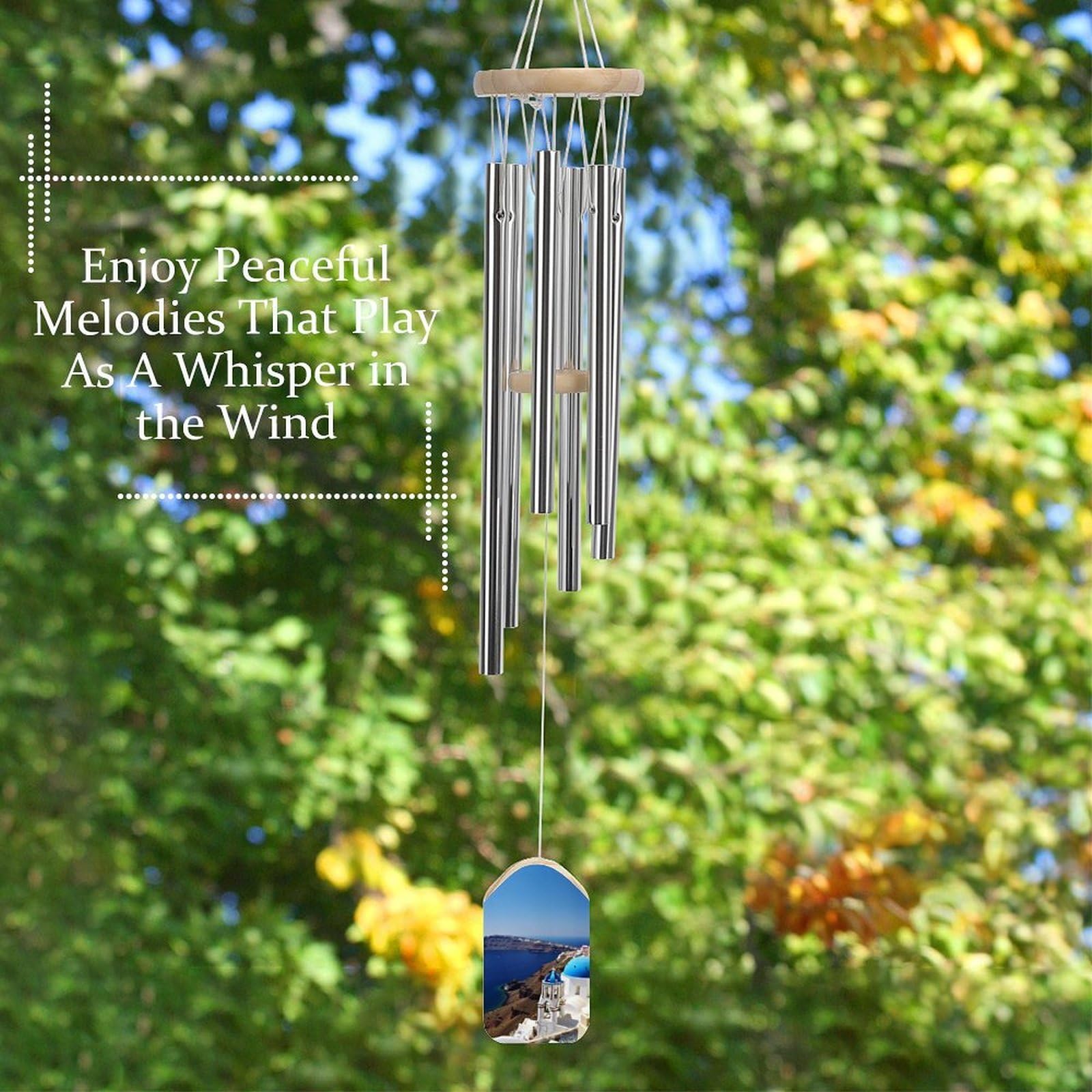 Carry the serene beauty of the Greek islands to your home with this Santorini-inspired wind chime. Handcrafted from natural wood and tuned aluminum tubes, it delivers soft, melodic harmonies with every gentle breeze—perfect for creating moments of peace on your patio, porch, or balcony.
