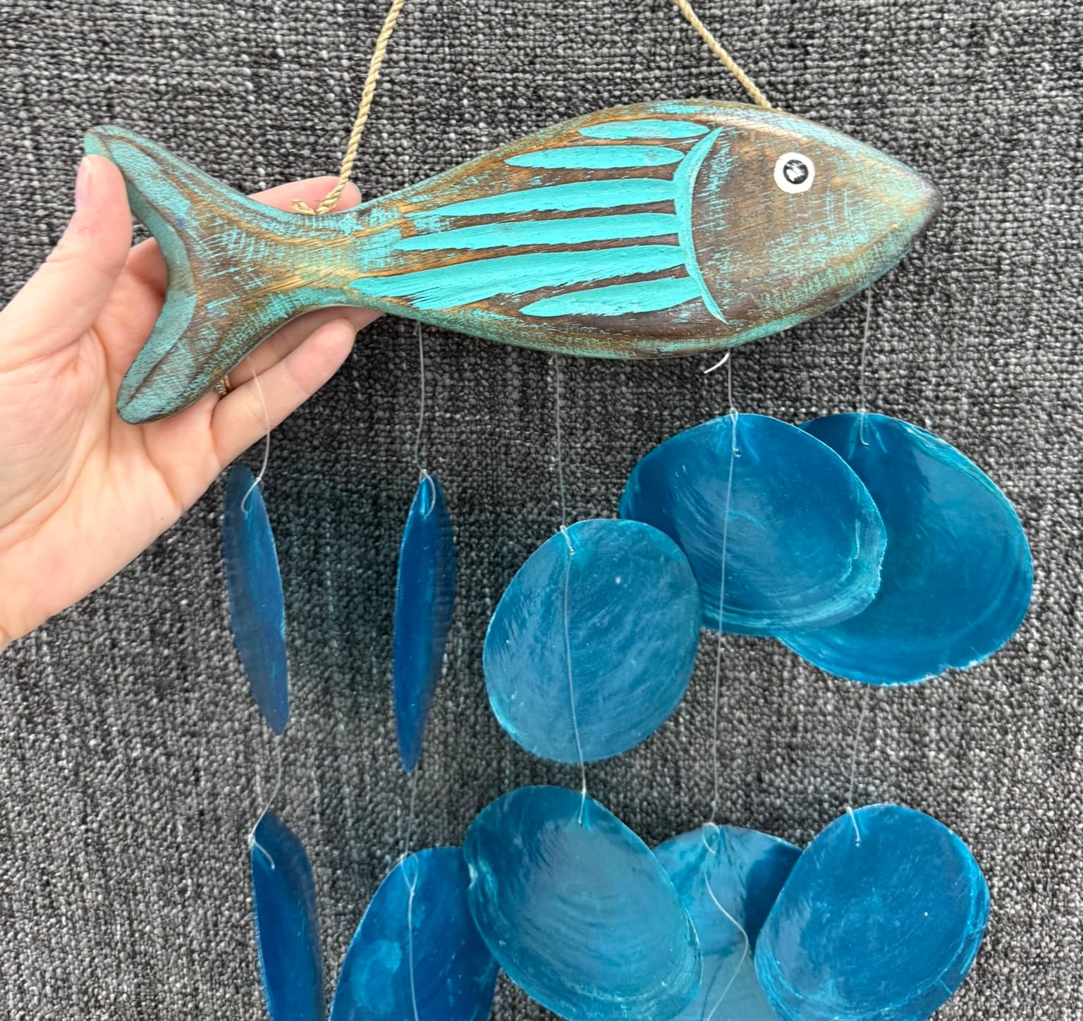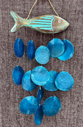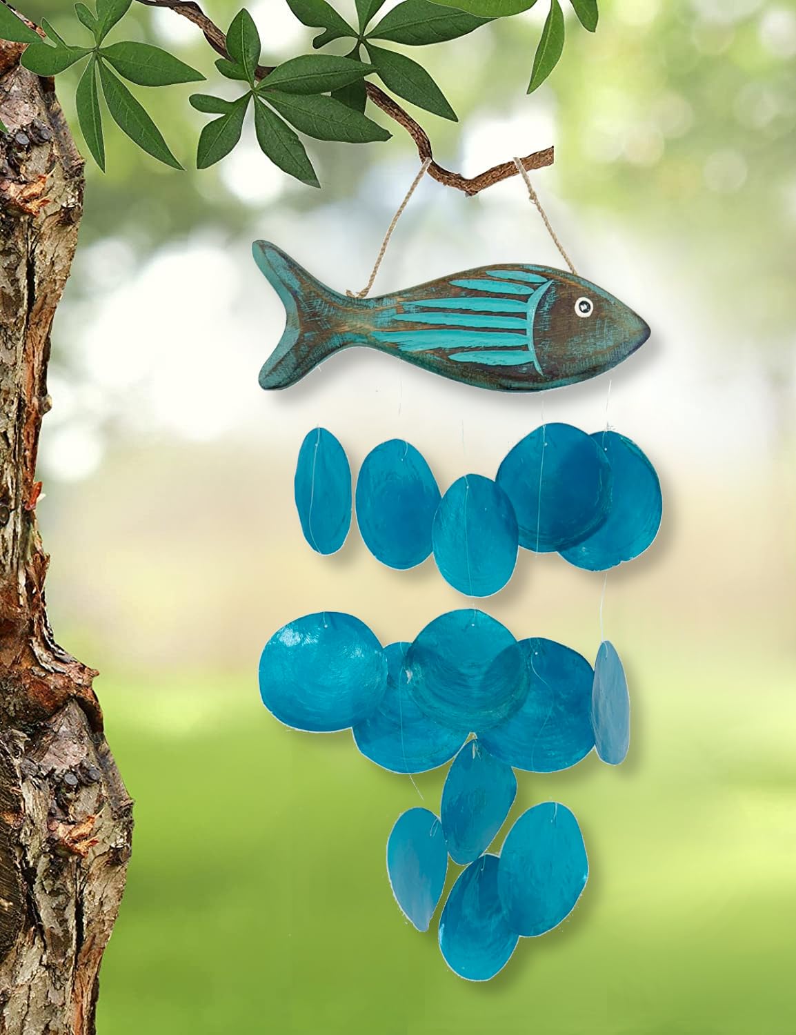 Bring the calming essence of the coast to your home with this delicate teal blue wind chime. Handcrafted from natural capiz shells and carved wood fish, it combines gentle movement, soft sounds, and ocean-inspired beauty—perfect for adding a relaxed beach vibe to patios, porches, sunrooms, or lakehouse decor.