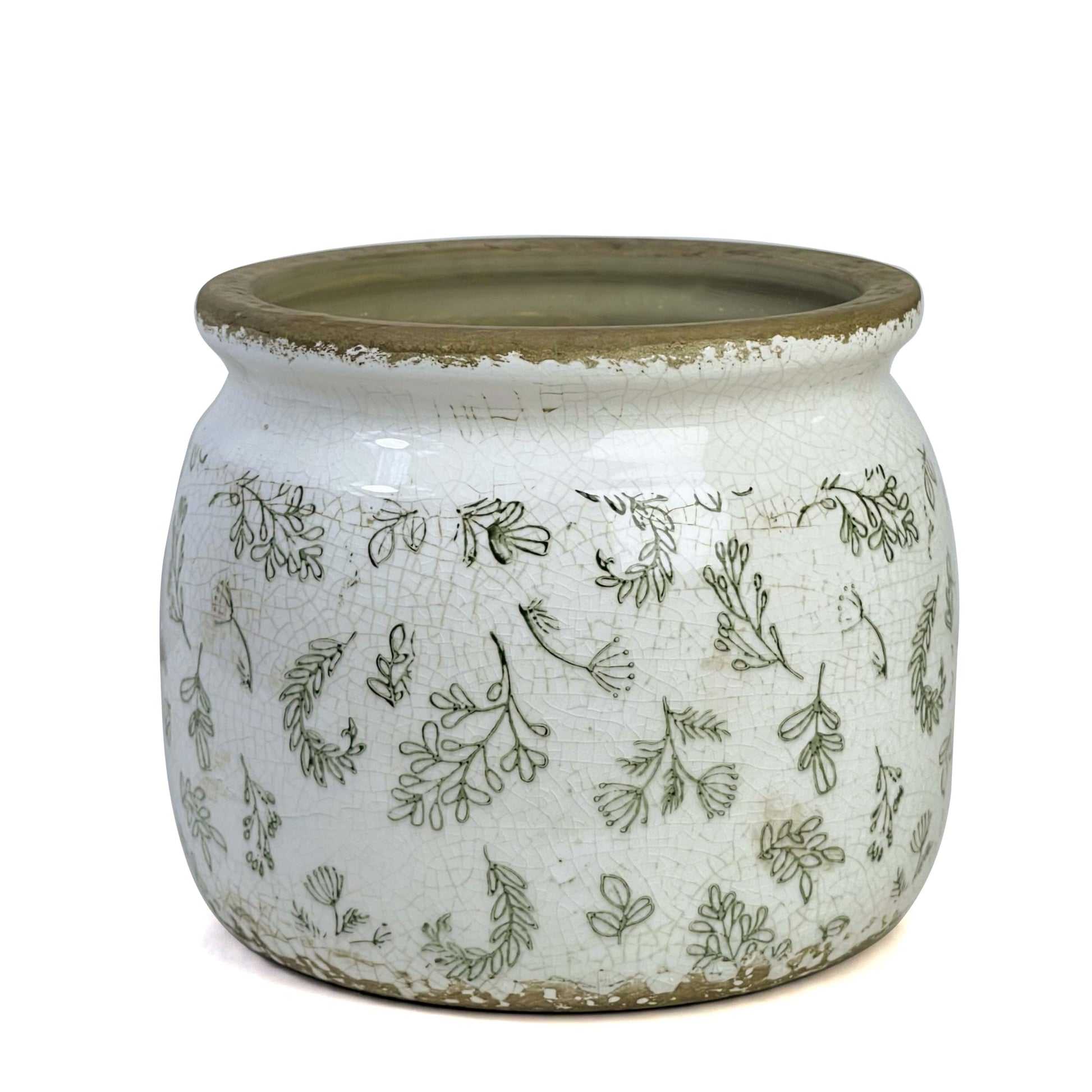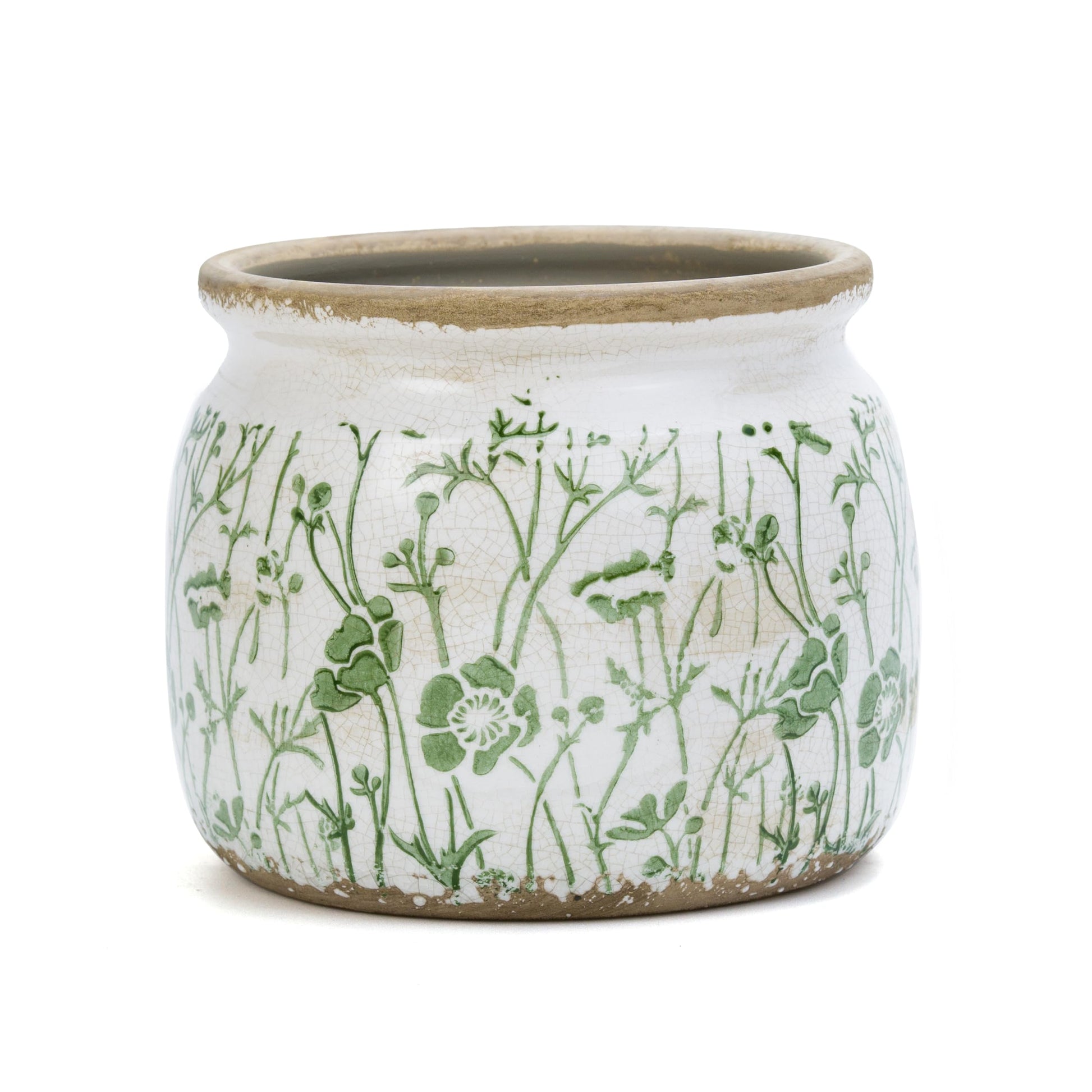 Embrace nature’s charm with this hand-finished ceramic planter. Its delicate ice-crackle texture and soft floral motifs bring a whisper of the countryside to your windowsill or garden nook. Designed with practical drainage to nurture small plants effortlessly.